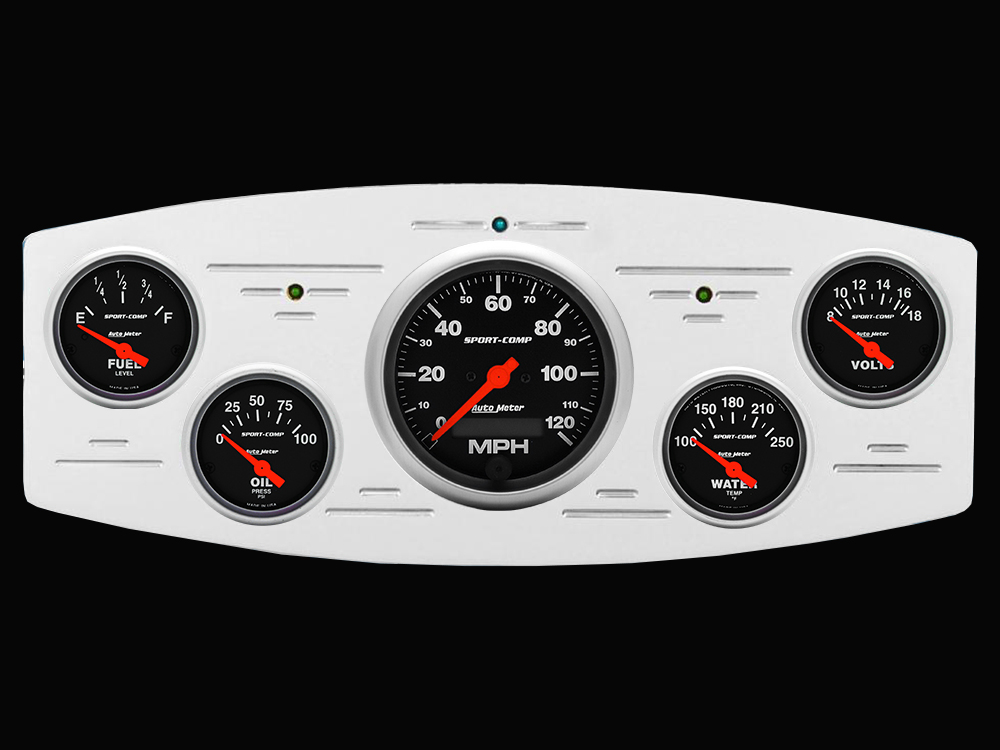 Includes aluminum gauge panel, Auto Meter Sport-Comp gauges, & LED lights (turn signal & high beam indicators).