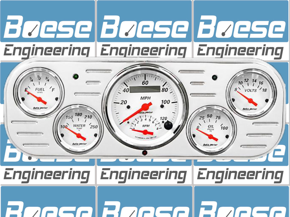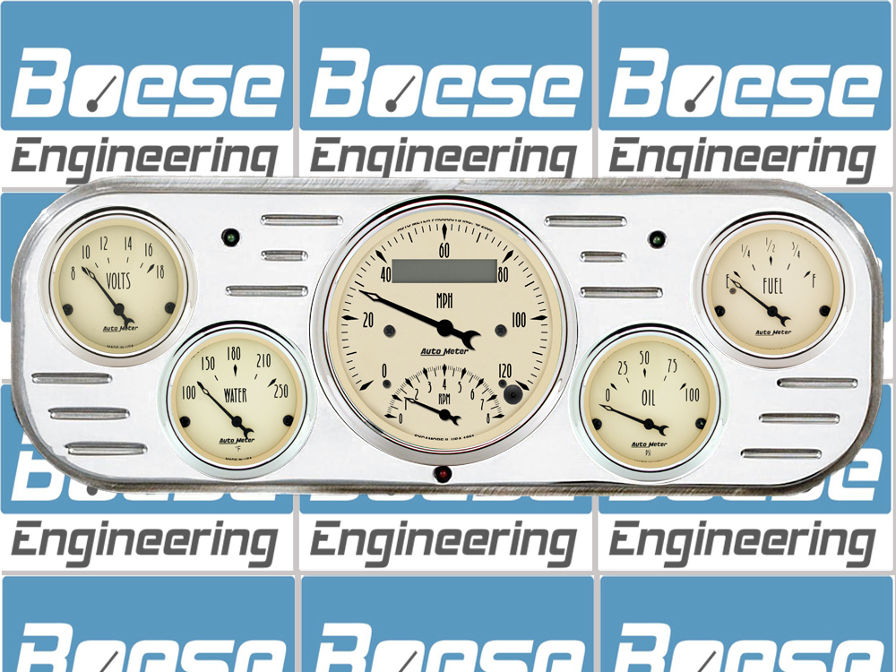 Includes aluminum dash insert, Auto Meter Street Rod series gauges and LED lights (turn signal & high beam indicators.).