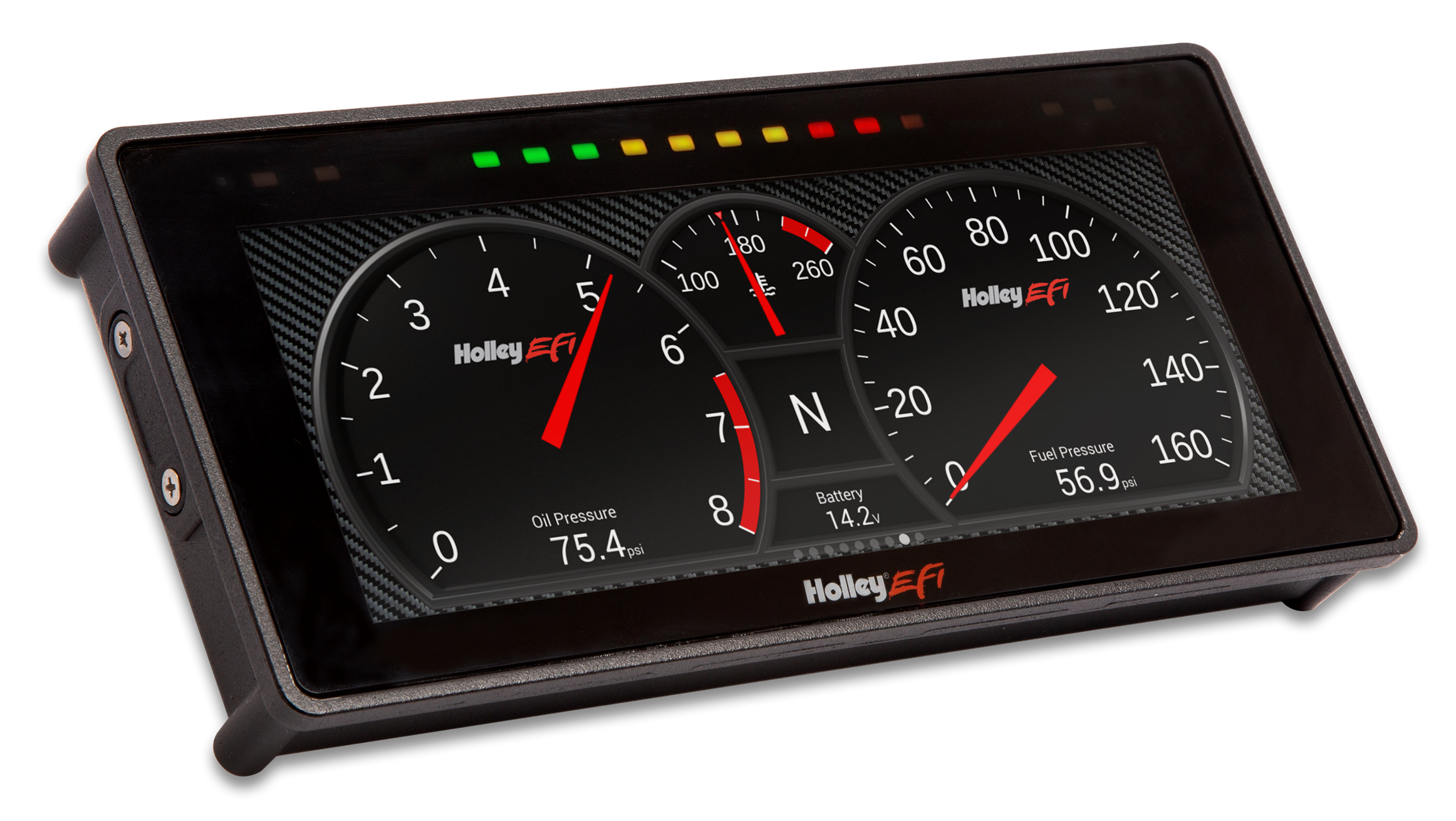 The Holley EFI 6.86″ Pro Dash is customizable with a variety of gauge and indicator screens that can be programmed to display any parameter you need from a Holley EFI system. It also includes an integrated ten LED shift light as well as two LED’s on the top left and two on the top right that can be programmed as desired.