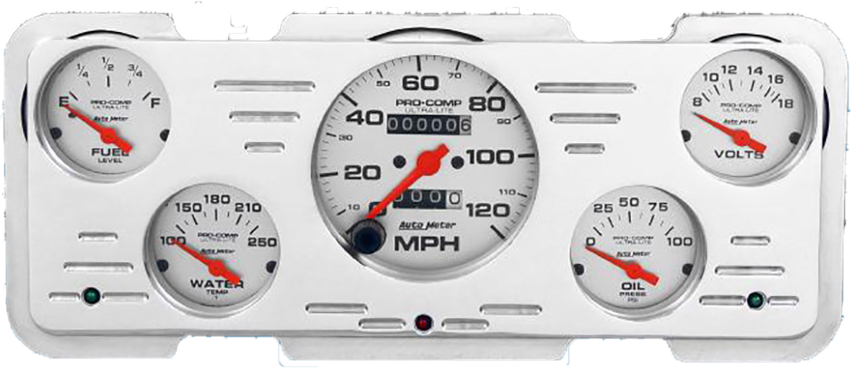 Includes aluminum gauge panel, Auto Meter Ultra-Lite gauges, & LED lights (turn signal & high beam indicators).