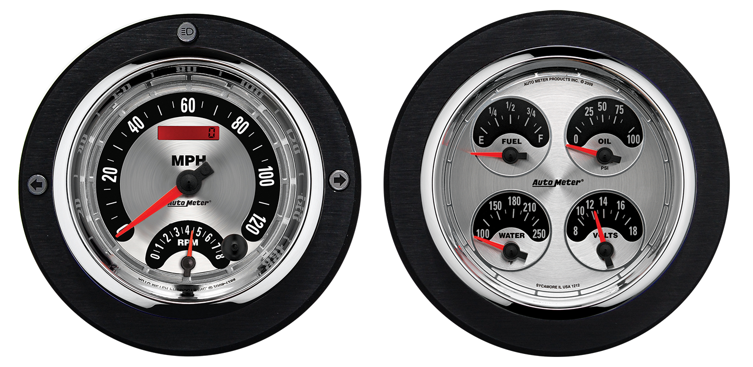 Includes brushed and black anodized aluminum adapter rings, Auto Meter American Muscle 5″ gauges, & 8 MM LED lights (turn signal & high beam indicators).