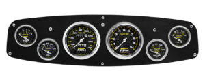 Includes brushed and black anodized aluminum gauge panel, AutoMeter Carbon Fiber gauges, & LED turn signal & high beam indicators.