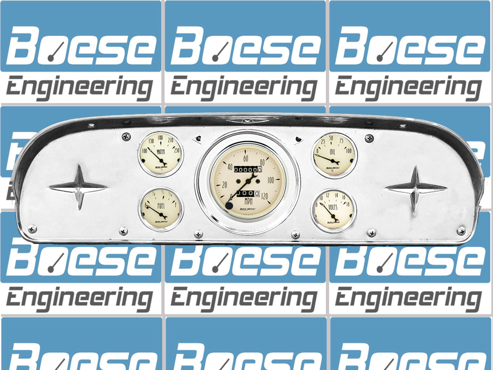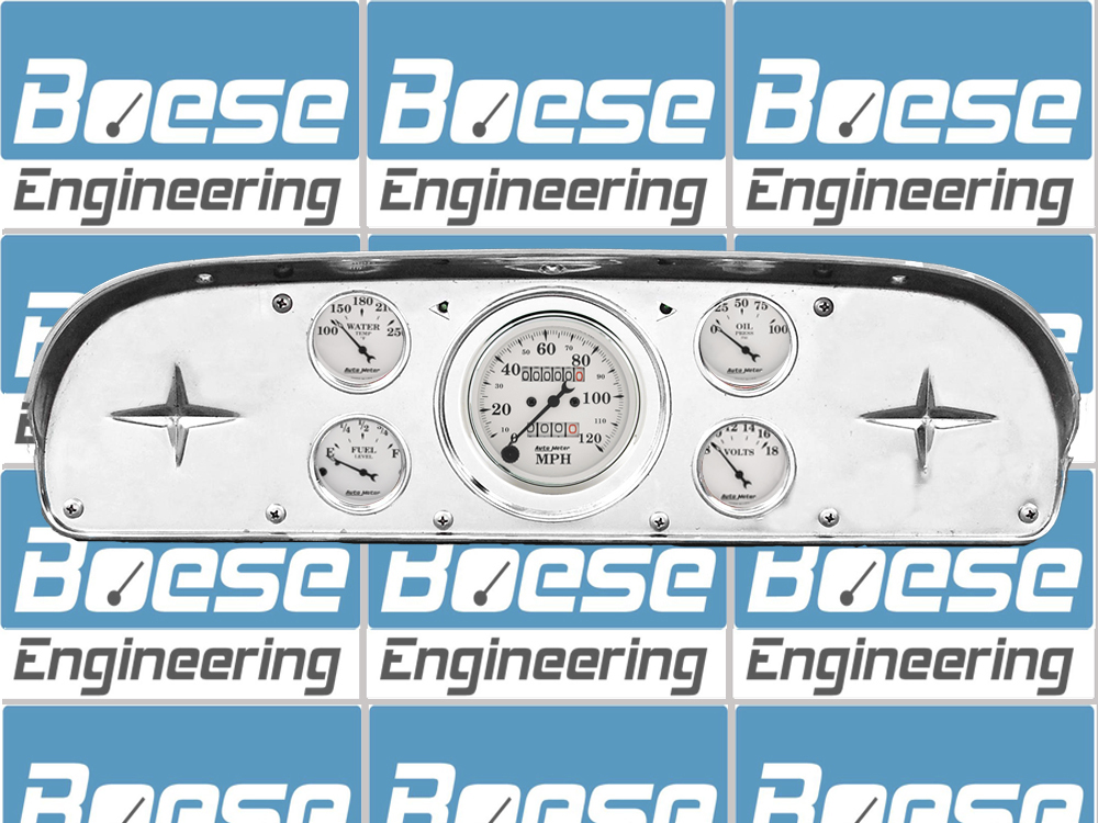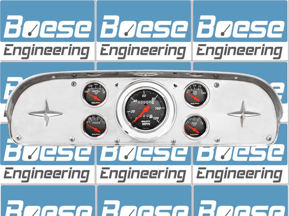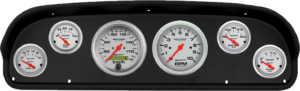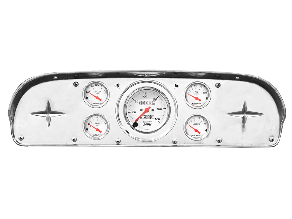 Includes aluminum dash adapter panel, Auto Street Rod series gauges & turn signal indicators.