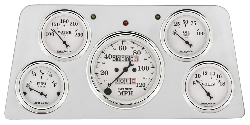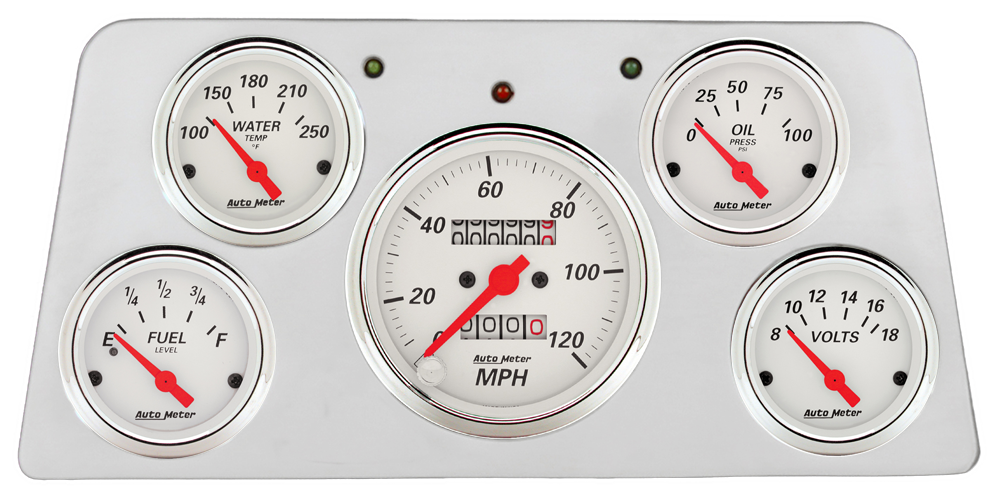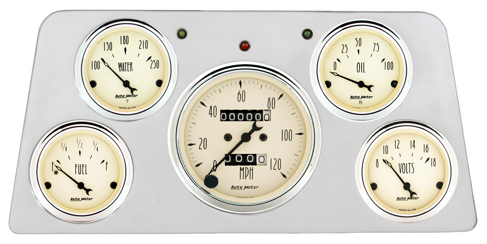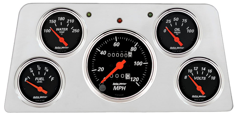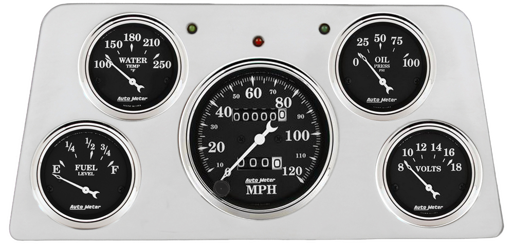 Includes aluminum dash insert, Auto Street Rod series gauges & turn signal/high beam indicators.