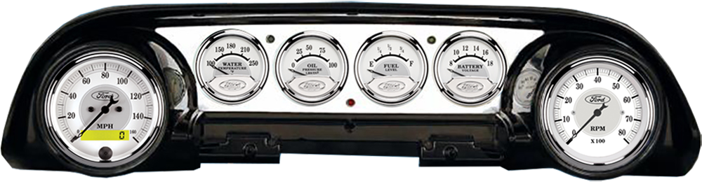 Includes aluminum gauge panel, Auto Meter Ford Masterpiece Silver gauges, & turn signal/high beam indicators.