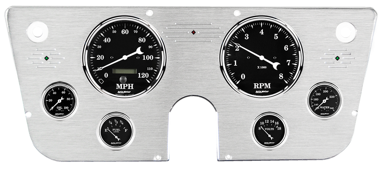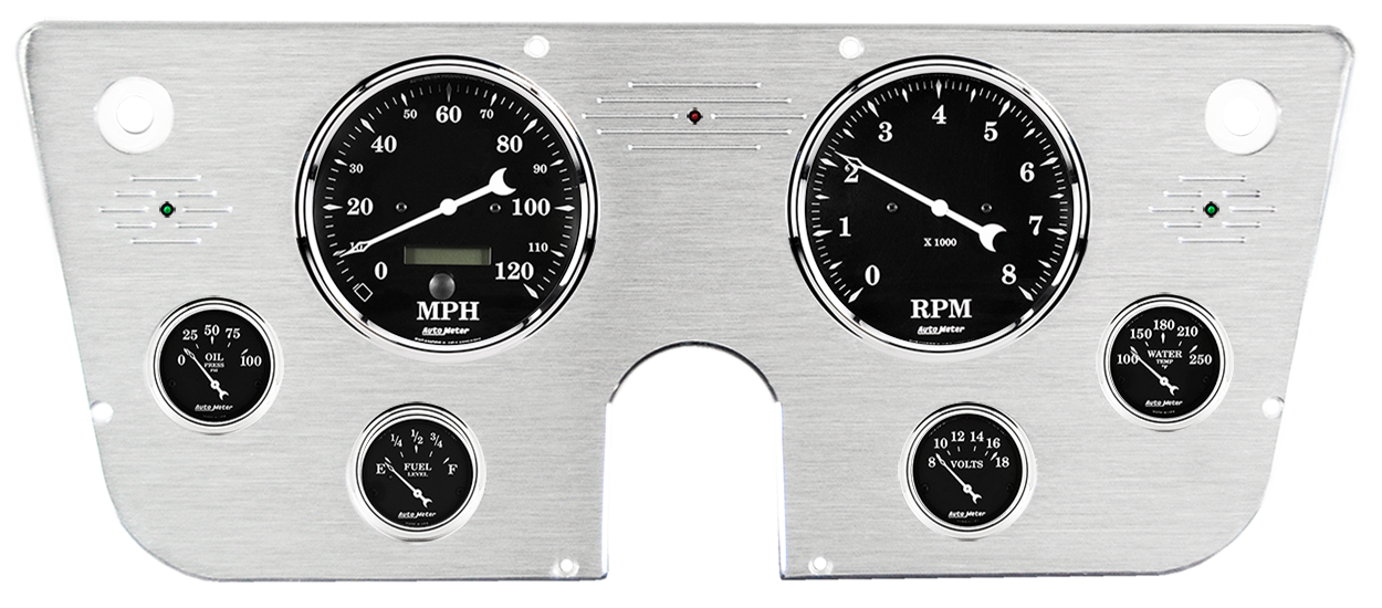 Includes aluminum dash insert, Auto Meter Old Tyme Black gauges, & turn signal/high beam indicators.