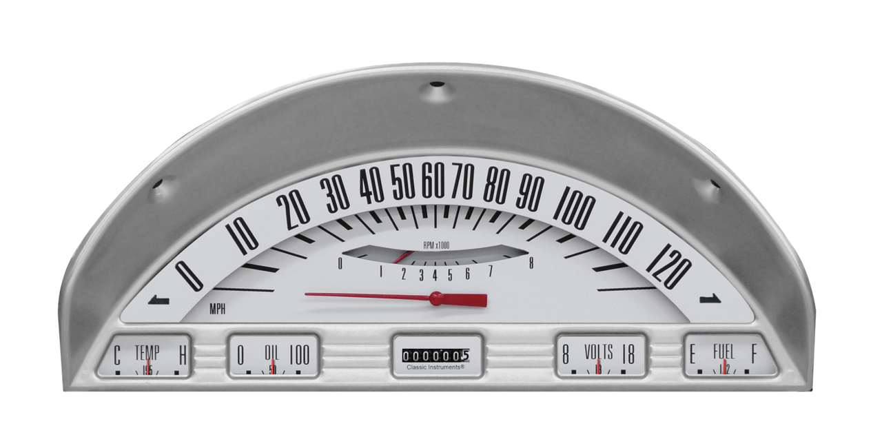 This package is an updated, complete replacement to the original gauges. The electronic cluster features speedometer, tachometer, fuel (75-10 ohms), water temp, oil pressure and volt gauges. Design features include a multi-layer dial design, OE styled graphics, red pointers, original styled green arrow turn indicators, red Halo high beam, LED illumination and easy connector for wiring. As always with Classic Instruments, it is backed by unsurpassed customer service and a 7 year warranty.